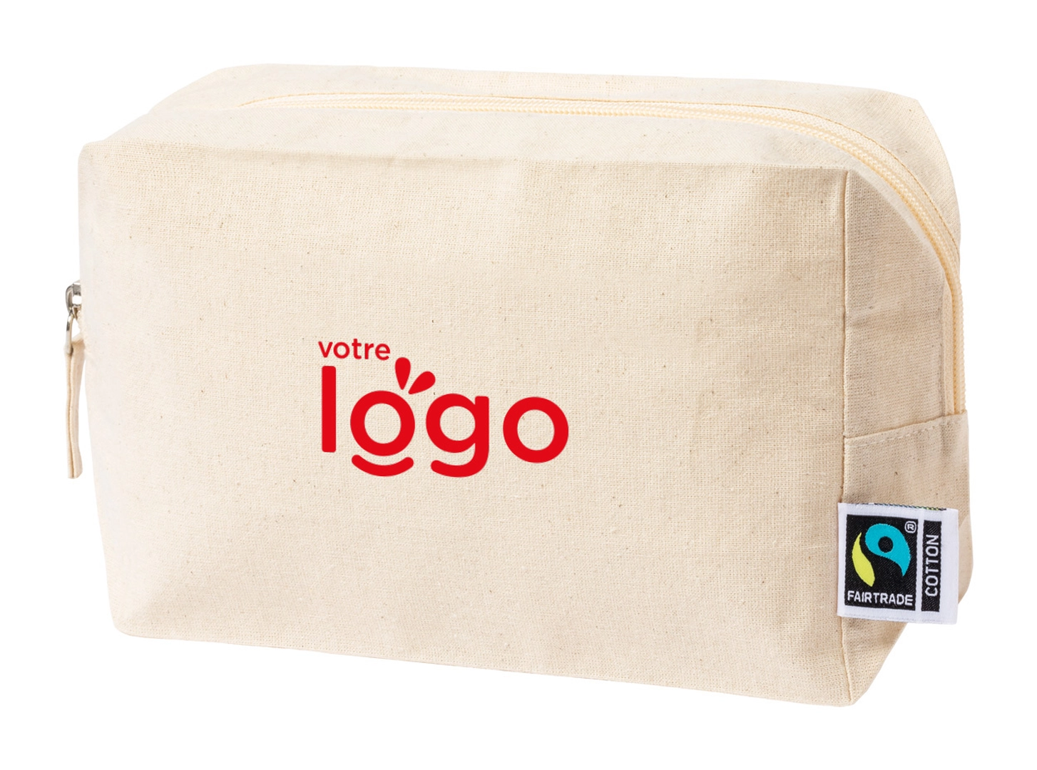 Trousse maquillage zippé en coton équitable avec étiquette distinctive commerce équitable. 100% coton équitable, 180 g/m².